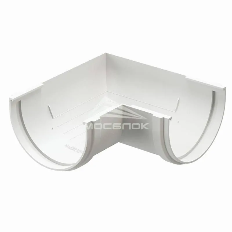 Угол желоба устанавливается на внешних и внутренних углах кровли и предназначен для соединения желобов под углом 90° в целях изменения направления движения воды.