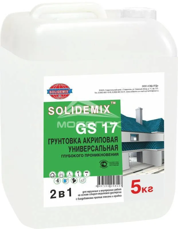 Грунтовка акриловая, глубокого проникновения «SOLIDEMIX GS 17», экологически чистый продукт, не содержит органический растворителей.
