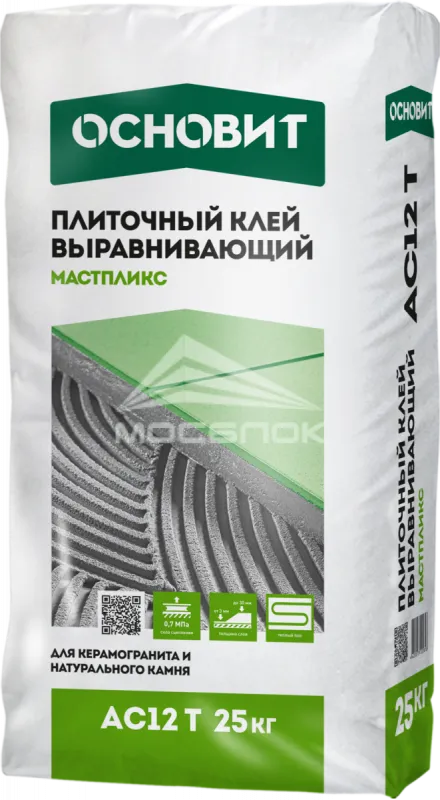 Клей для керамической плитки Мастпликс AC12 T выравнивающий, 25 кг Основит. Технические характеристики и преимущества: